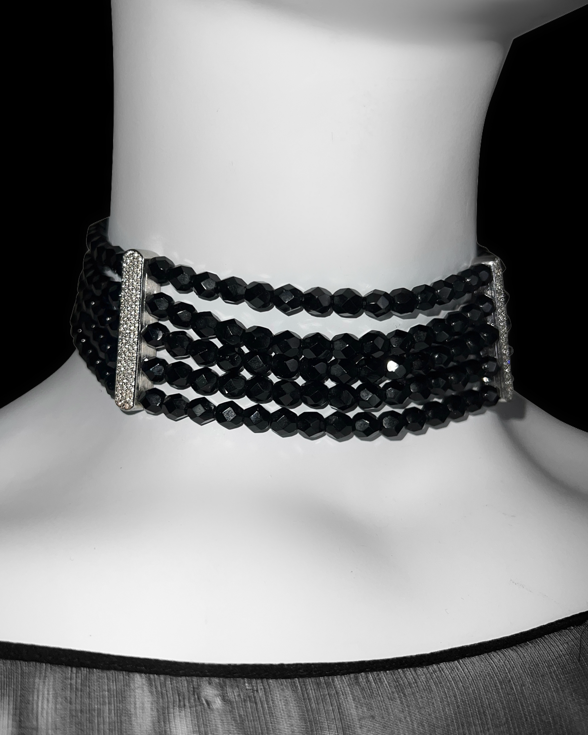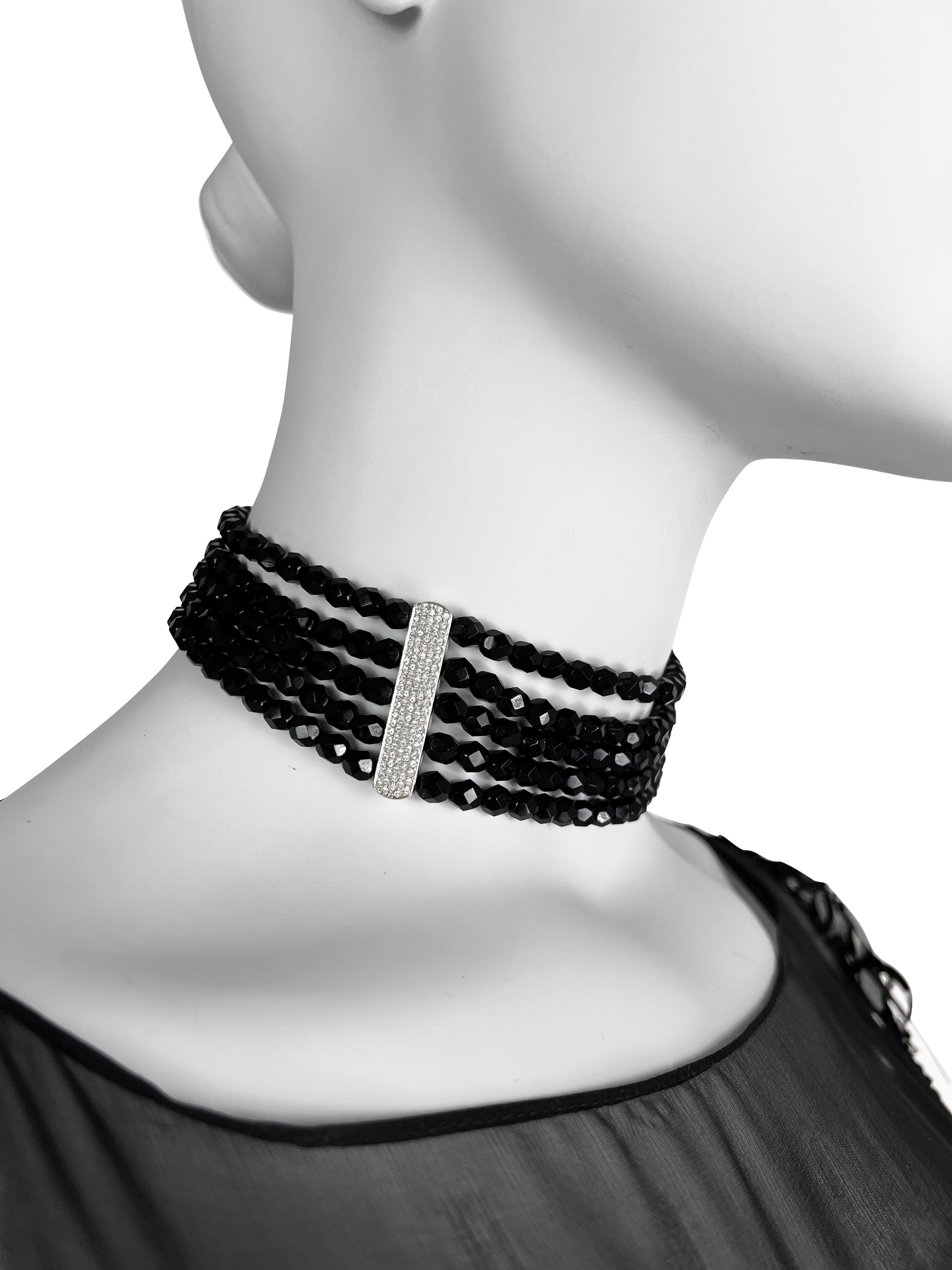 A gorgeous and very wearable choker from 1999 with reflective black glass beads and silver-toned pavé hardware.