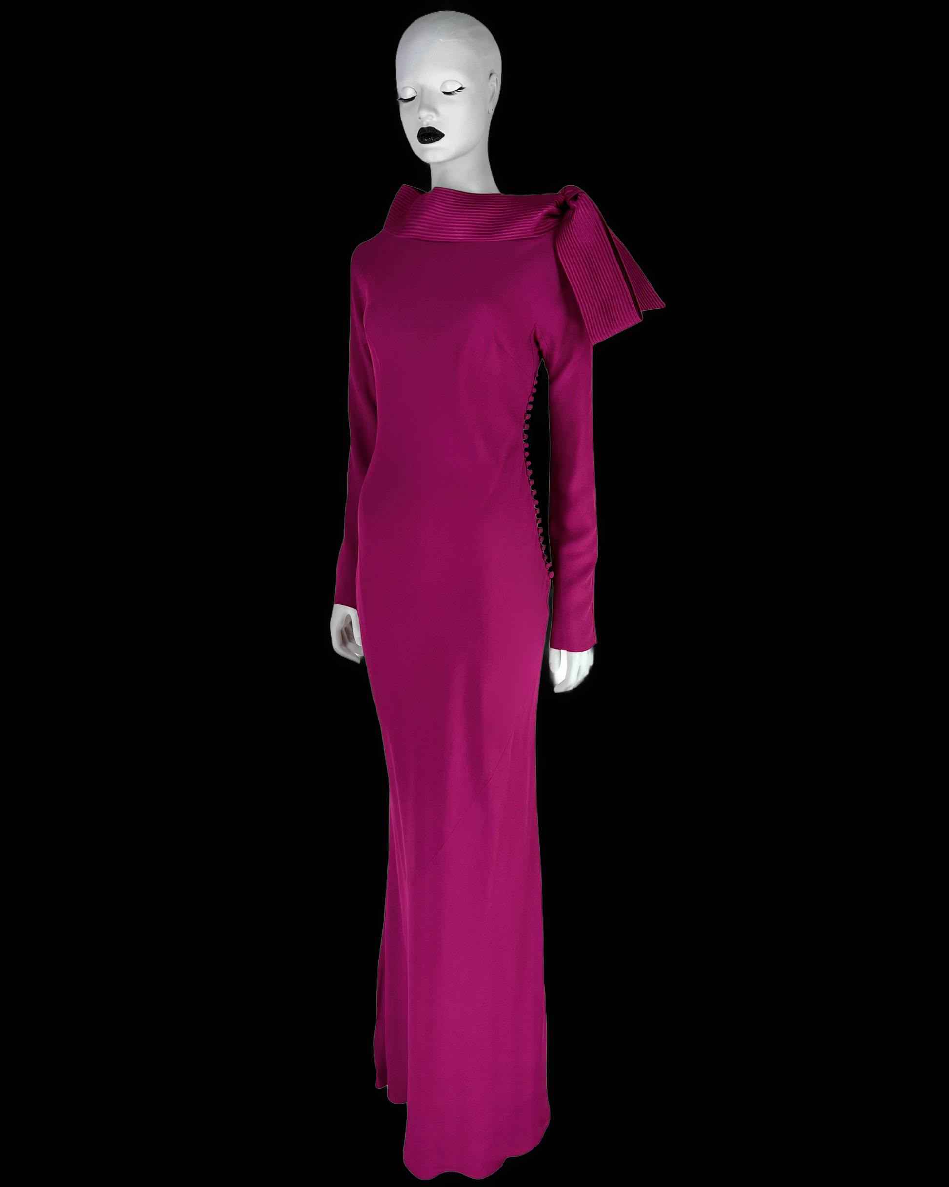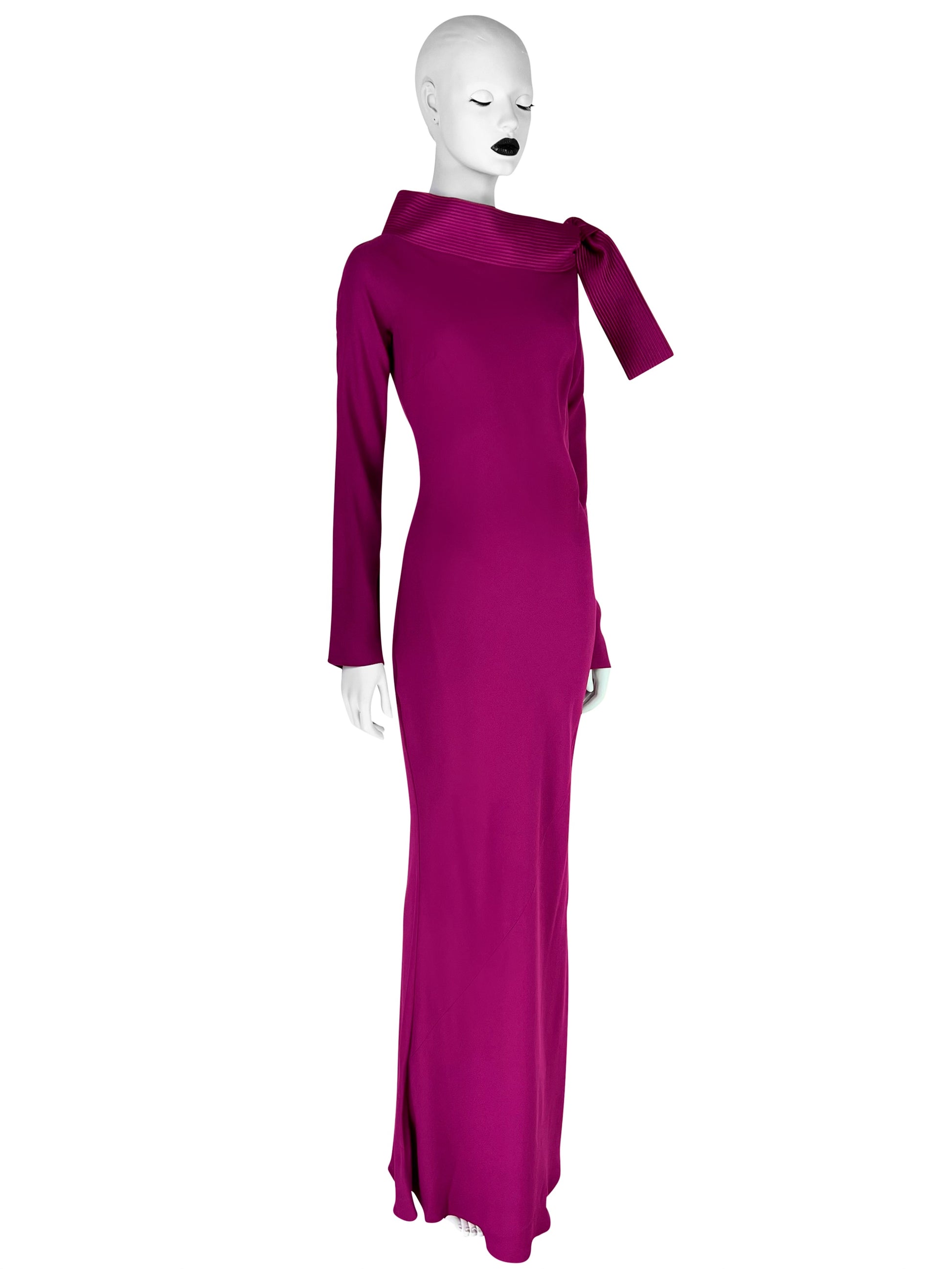A stunning and rare piece from the Fall 1999 collection by John Galliano for Dior. This dress is crafted from luxurious crepe fabric in a rare striking dark fuchsia/magenta color, making it a bold statement for any occasion. The sleek design features long sleeves and a satin collar with a unique knot detail that adds a touch of sophistication and elegance.