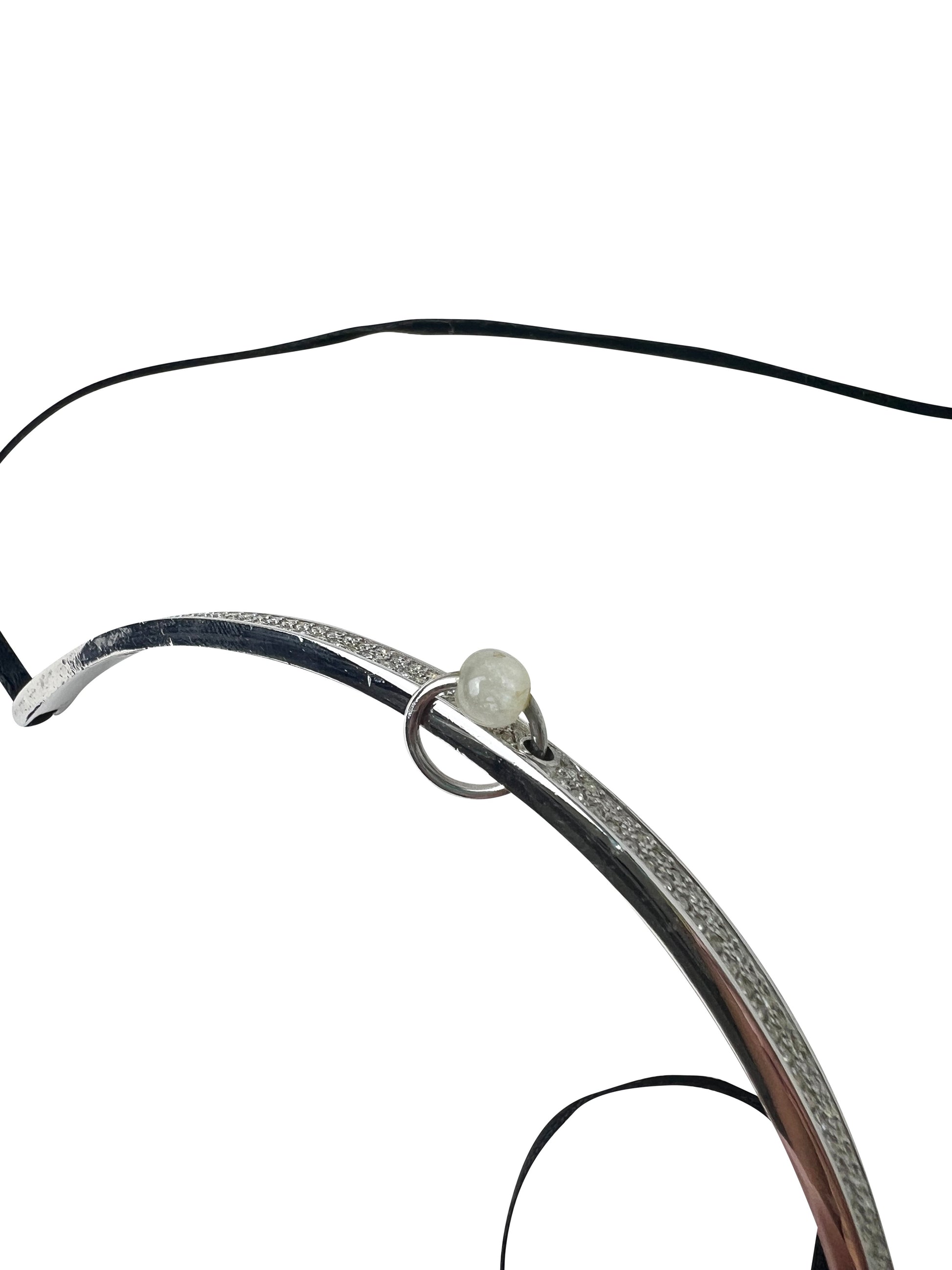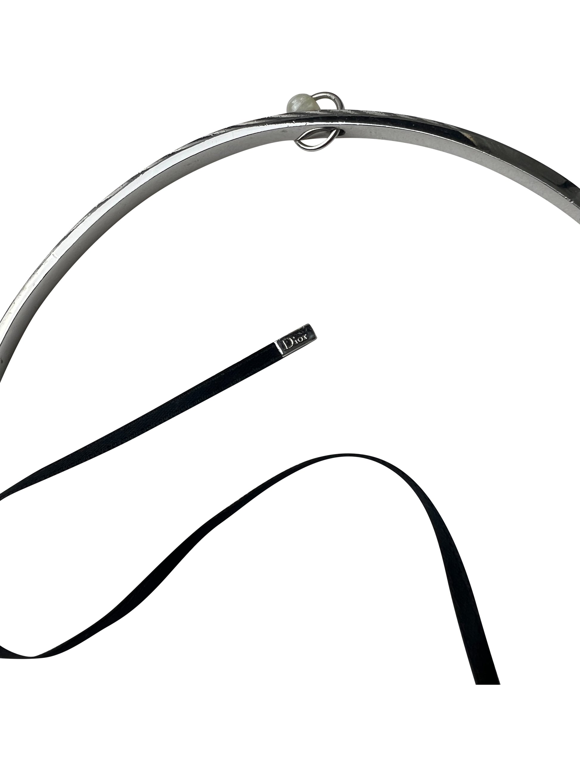 An exceptionally rare runway piece from Dior by John Galliano’s theatrical Fall 2003 collection, this choker exemplifies his edgy romanticism. Crafted with a rigid metal band fully encrusted with shimmering Swarovski crystals, it features a single dangling faux piercing bead detail at the front—a subtle nod to punk and fetish influences that defined Galliano’s Dior era. Finished with a satin ribbon tie closure for an adjustable fit and maximum comfort.