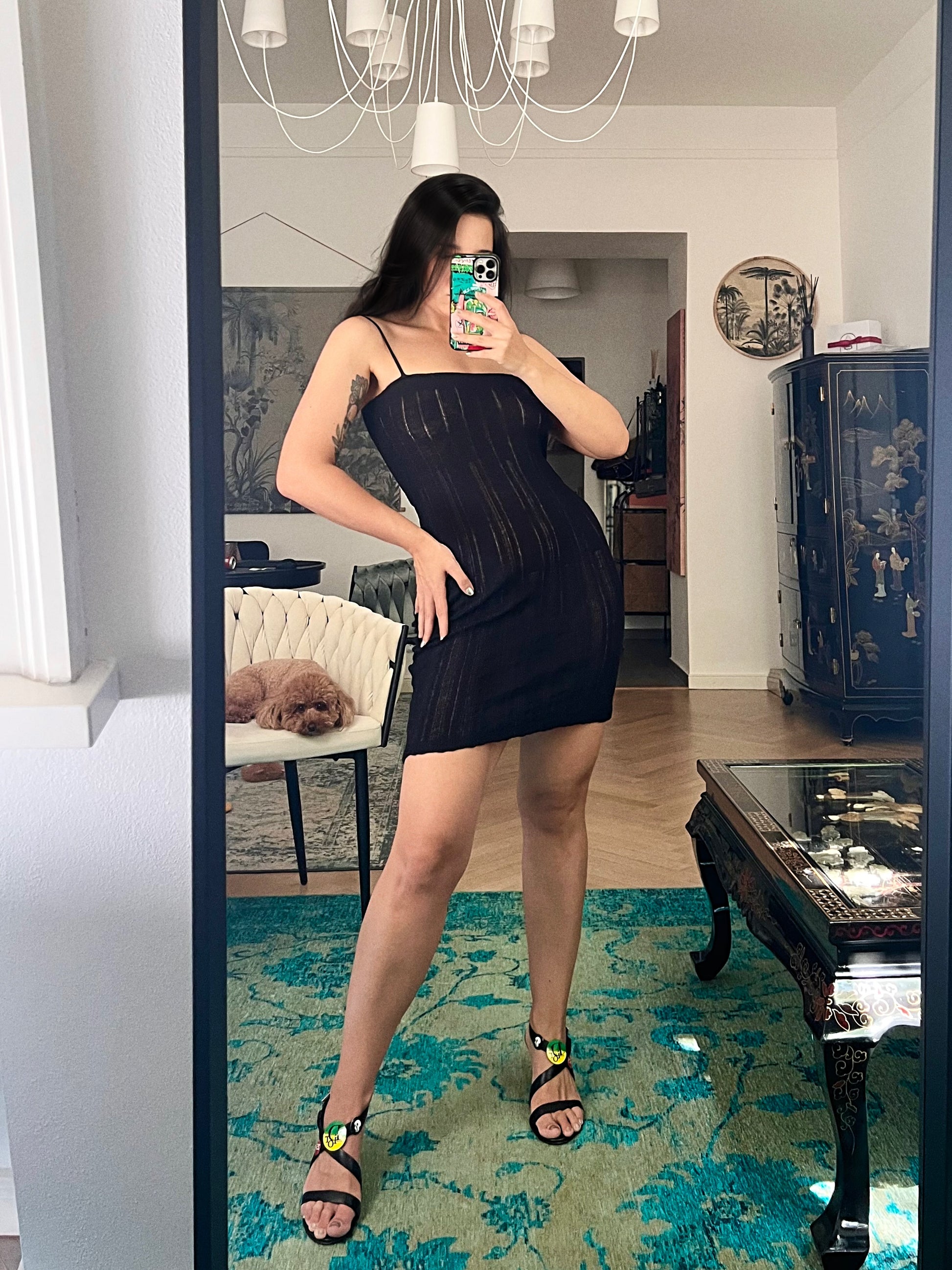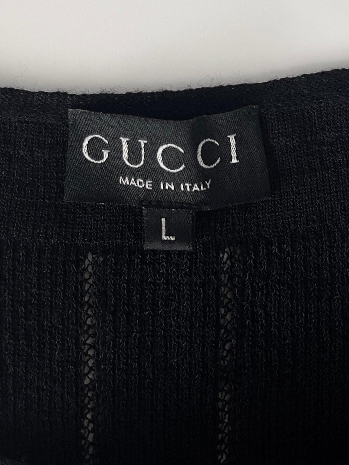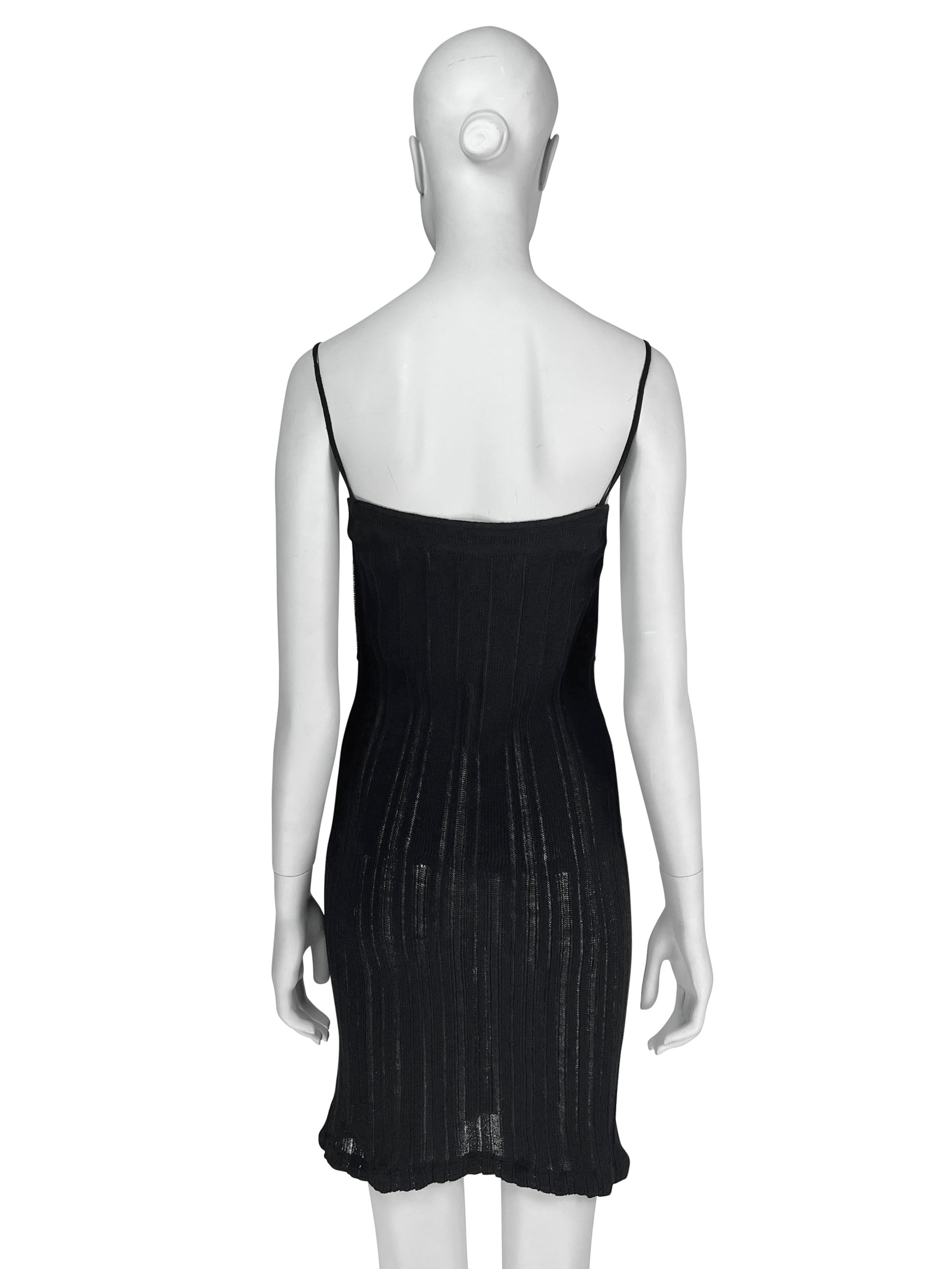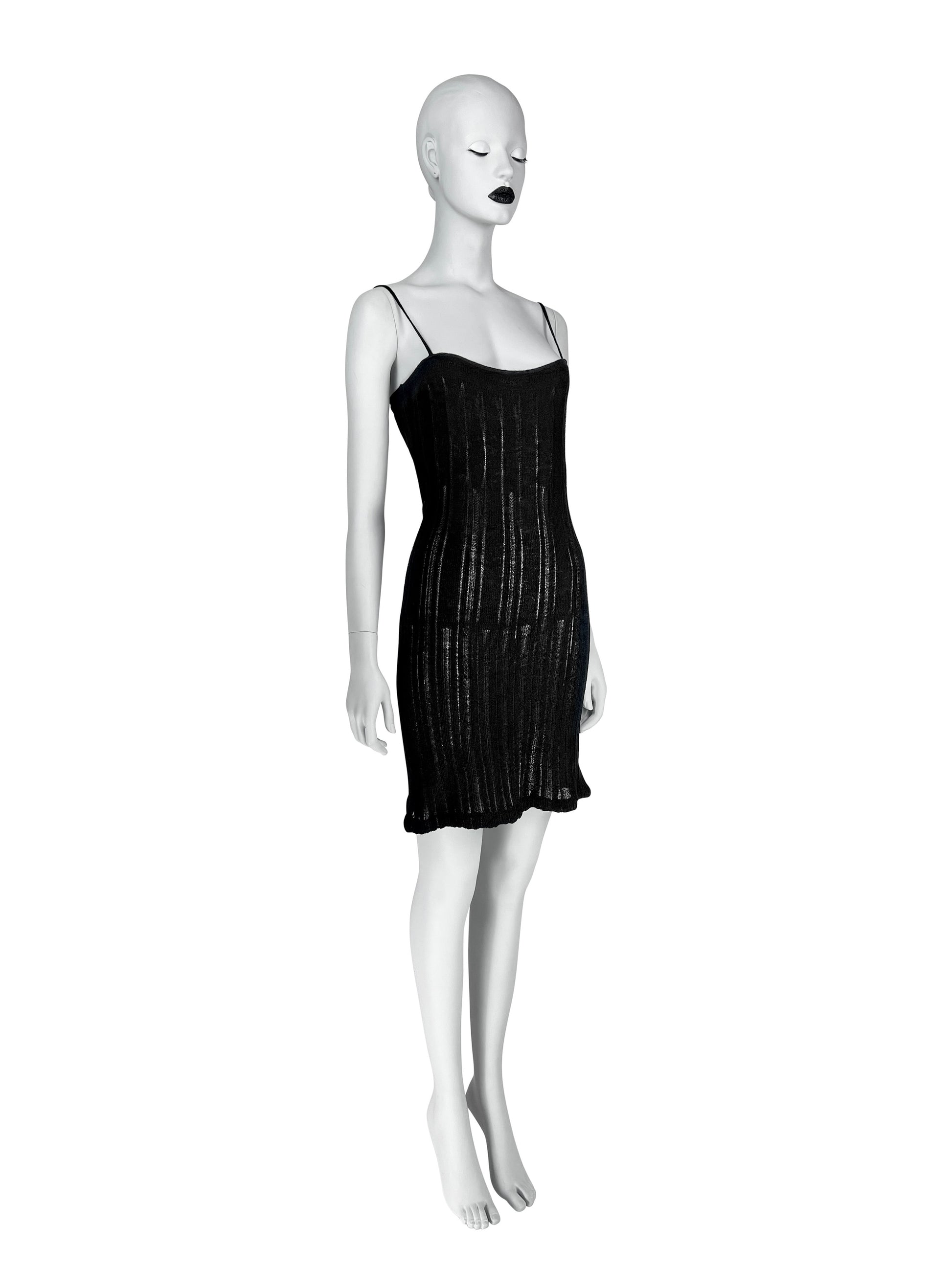 An iconic piece from Tom Ford’s Spring 1997 collection for Gucci — this black knitted dress perfectly captures the sensual minimalism of his era. Designed with thin spaghetti straps and a body-skimming silhouette, it features a ribbed open-knit texture that gives a semi-sheer effect without being fully see-through. While not technically lace or crochet, the knit structure has an airy, vertical open-work quality that elongates the figure.