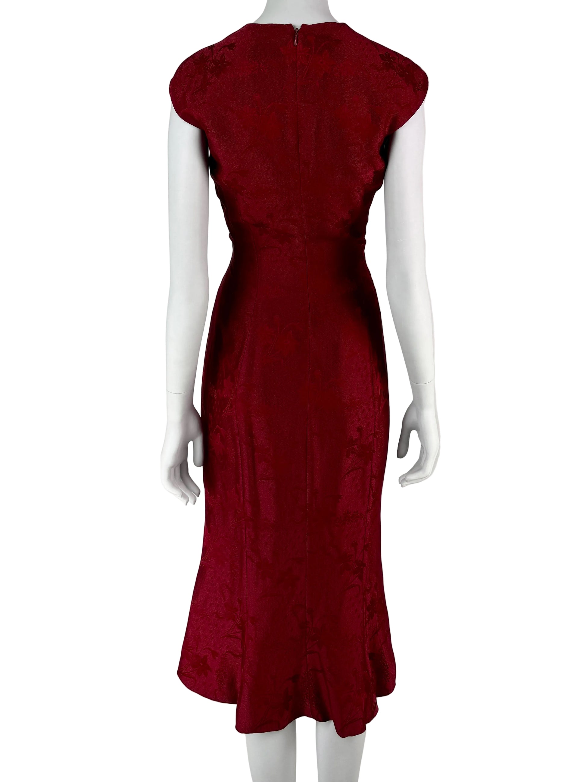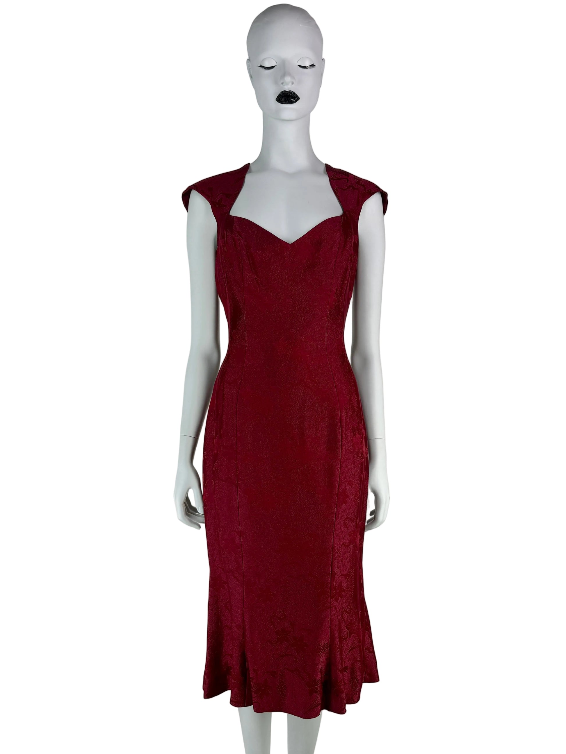 An exceptionally beautiful John Galliano Spring 1998 dress, executed in a rich wine-red jacquard with a subtle floral motif. This model represents one of Galliano’s most elegant and sensual late-1990s silhouettes, combining couture-level cut with refined ready-to-wear wearability.