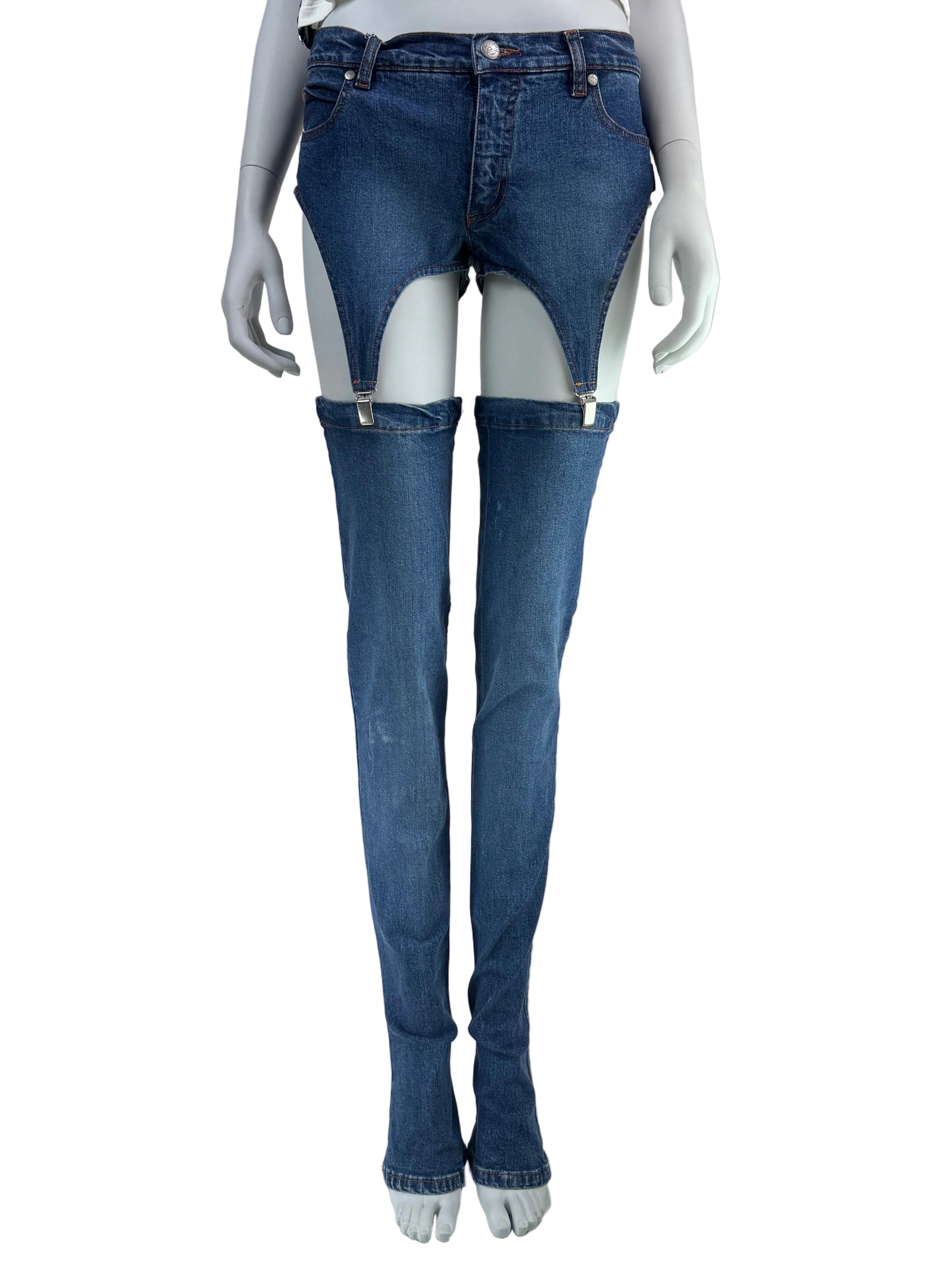 This design fuses low-rise denim with functional garter construction, allowing the trousers to be worn both as full-length jeans or as statement shorts with detachable stocking legs. The lower sections feature a subtle bootcut shape, designed to fall perfectly over shoes, enhancing the elongated silhouette.