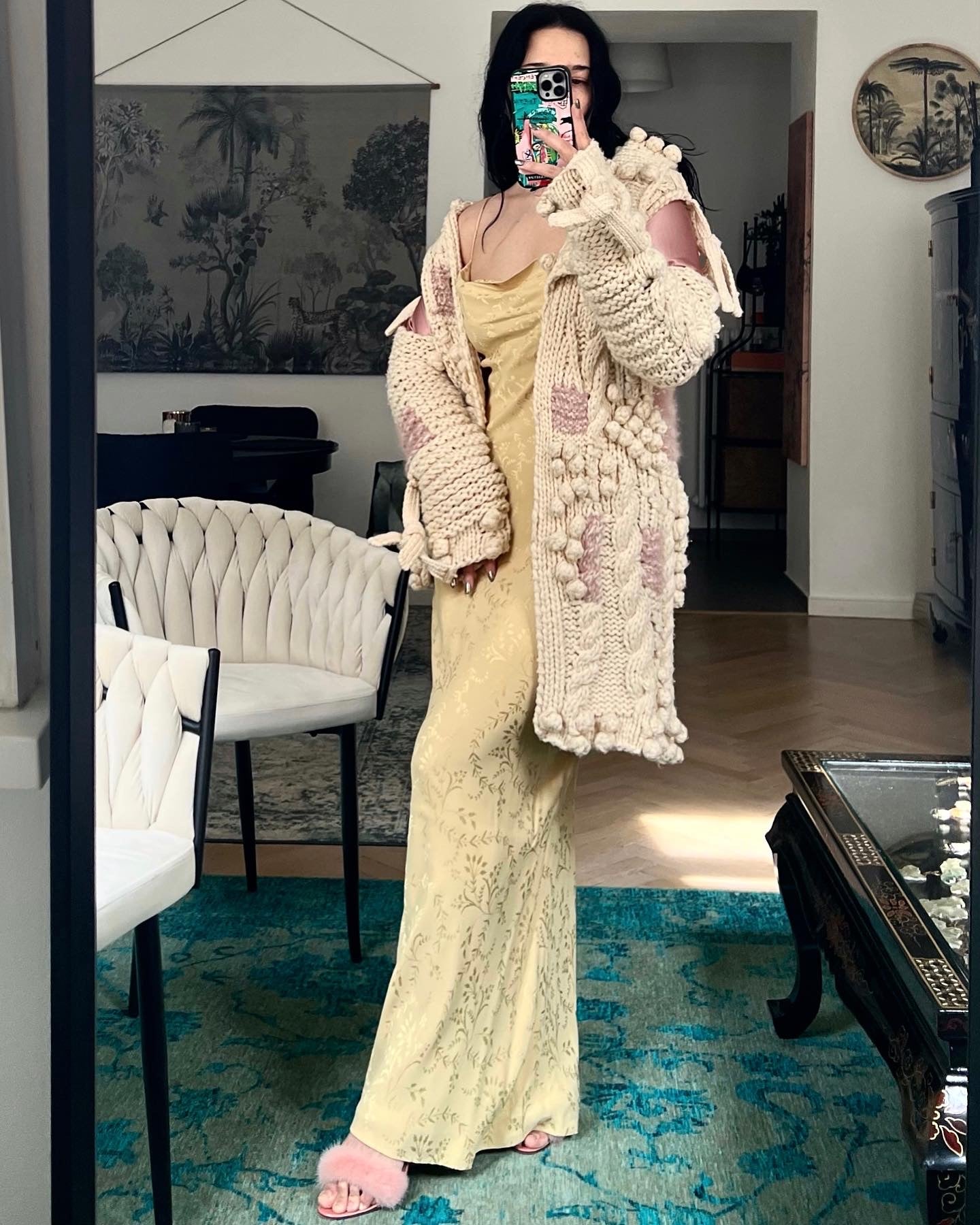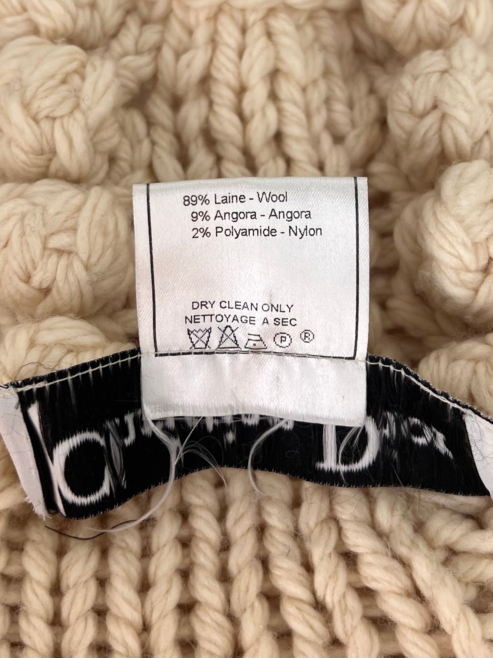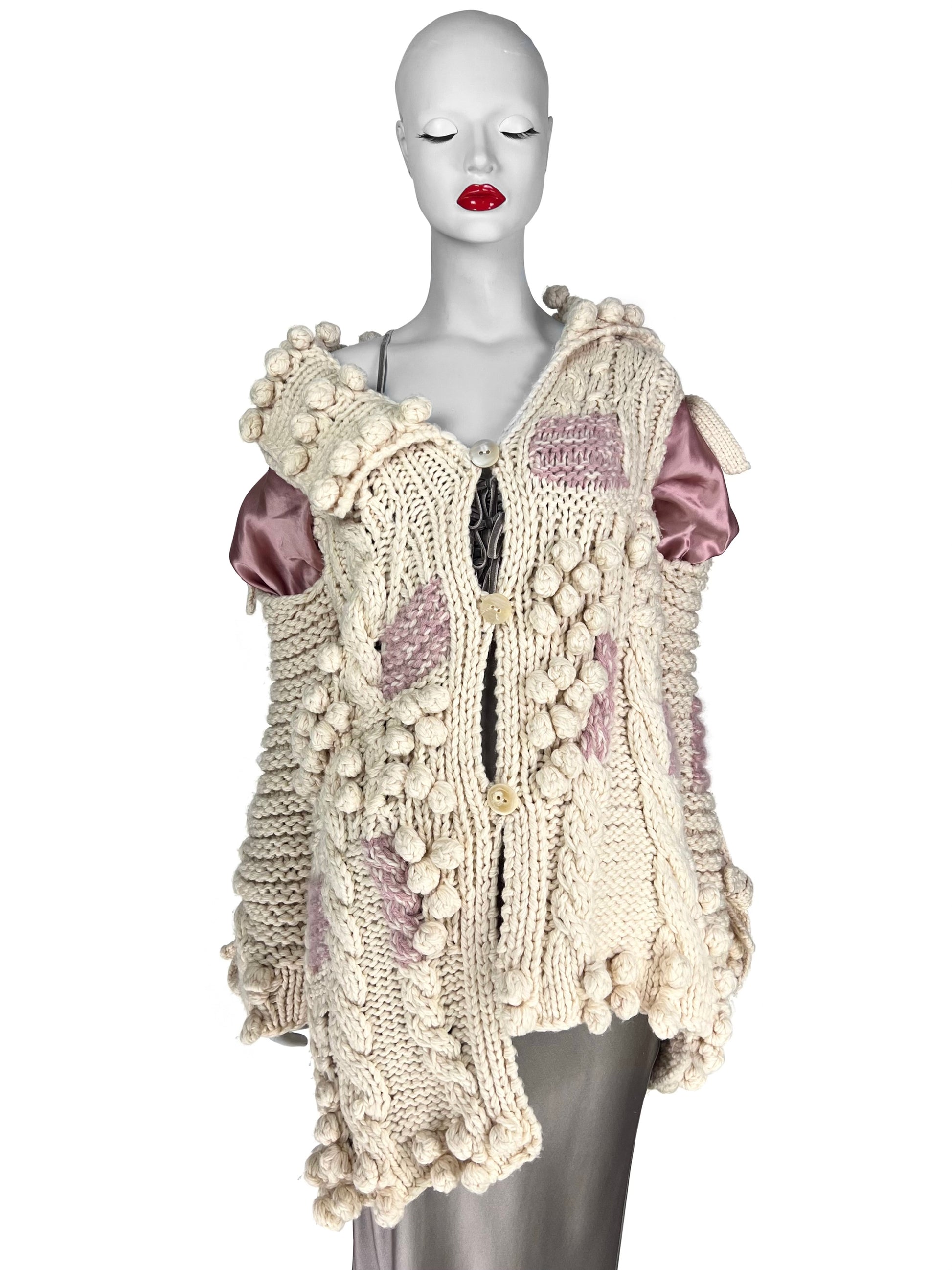 A rare runway piece from Christian Dior by John Galliano Fall 2000 Ready-to-Wear, this oversized knitted cardigan is an iconic example of Galliano’s signature knitwear silhouettes of the era. Crafted in a heavy cable knit wool blend with playful pom-pom textures, it features soft blush-toned silk satin inserts on the sleeves. The cardigan’s asymmetrical cut and dramatic volume reflect Galliano’s unique interplay of romanticism and deconstruction, while maintaining a wearable coziness.