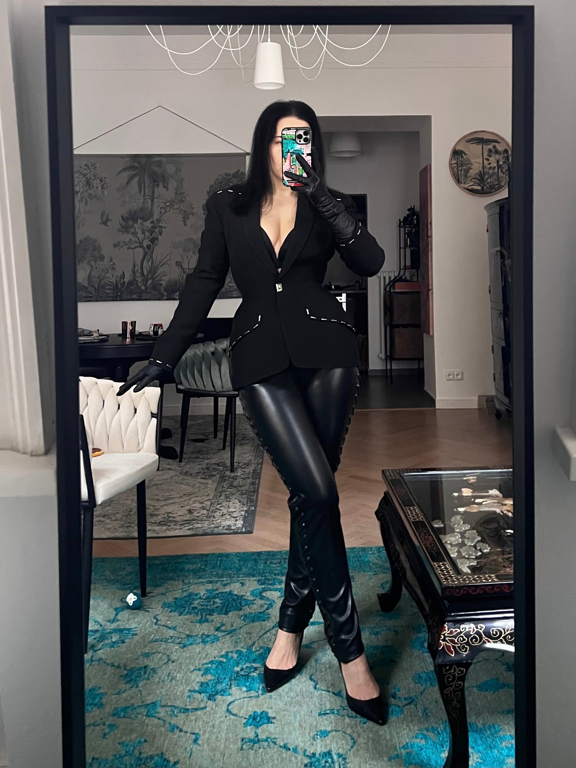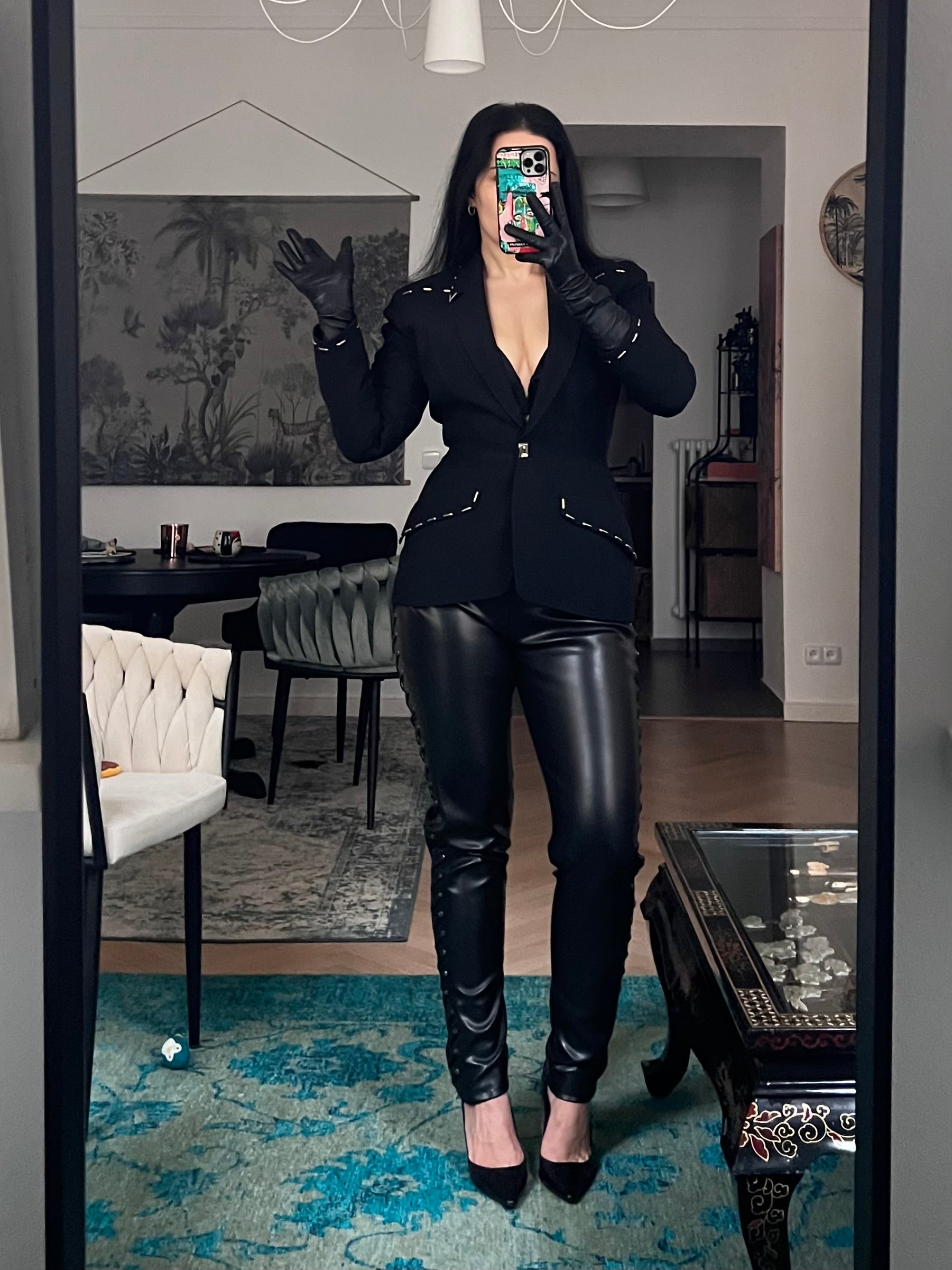 Pair this blazer with high-waisted trousers or a pencil skirt for a femme-fatale take on power dressing, or wear it over a bodycon dress for a sleek evening silhouette. Finish the look with sculptural heels or tall boots and bold accessories.